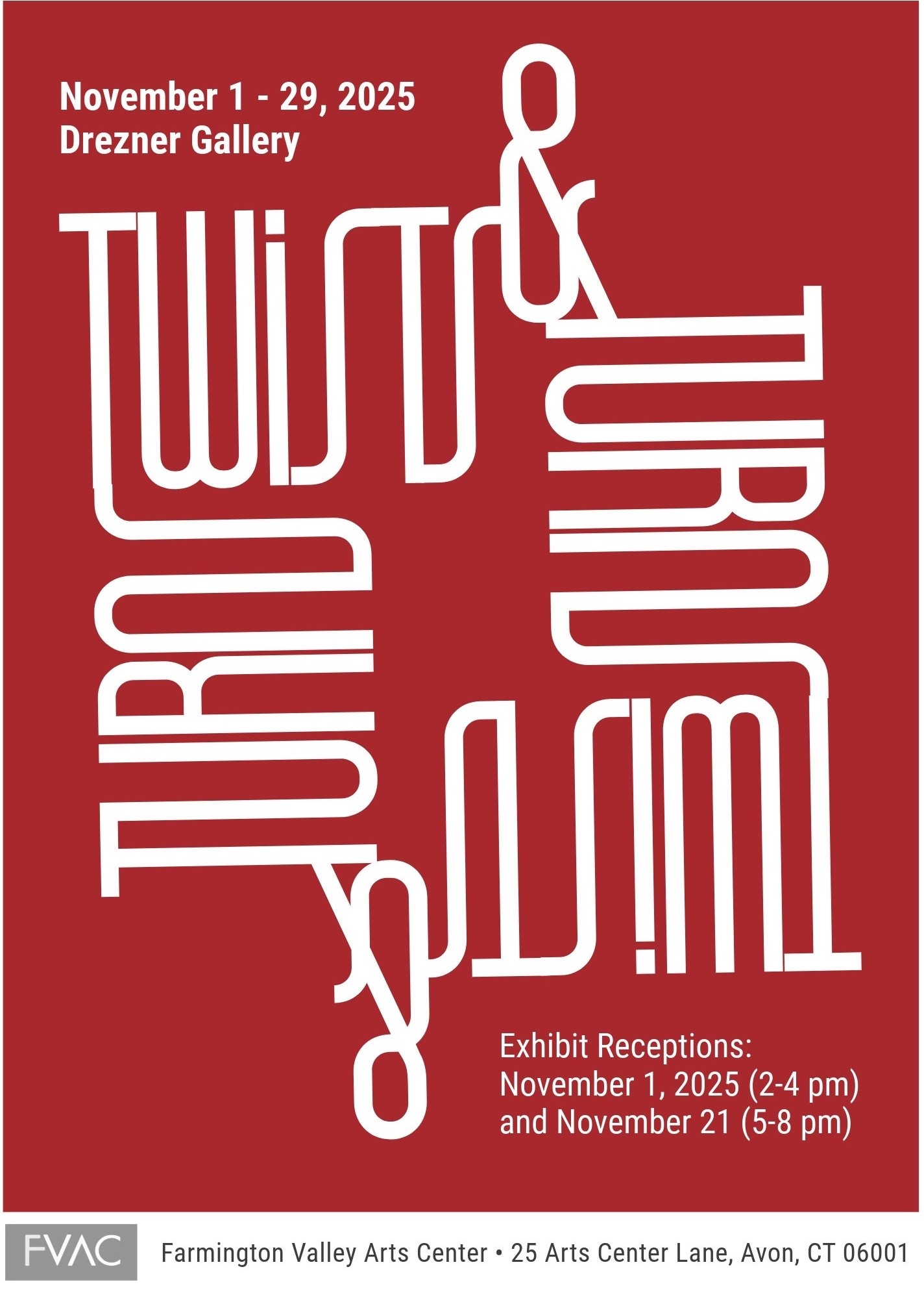 "Twists & Turns" which will feature 2D and 3D artwork in response to the theme. It could be a literal or metaphorical interpretation, a recurring characteristic in the artwork, a representation of a personal or life event, or perhaps something else. Creativity encouraged! Prizes will be awarded and the presentation will take place on November 1st at 3pm during the opening reception.